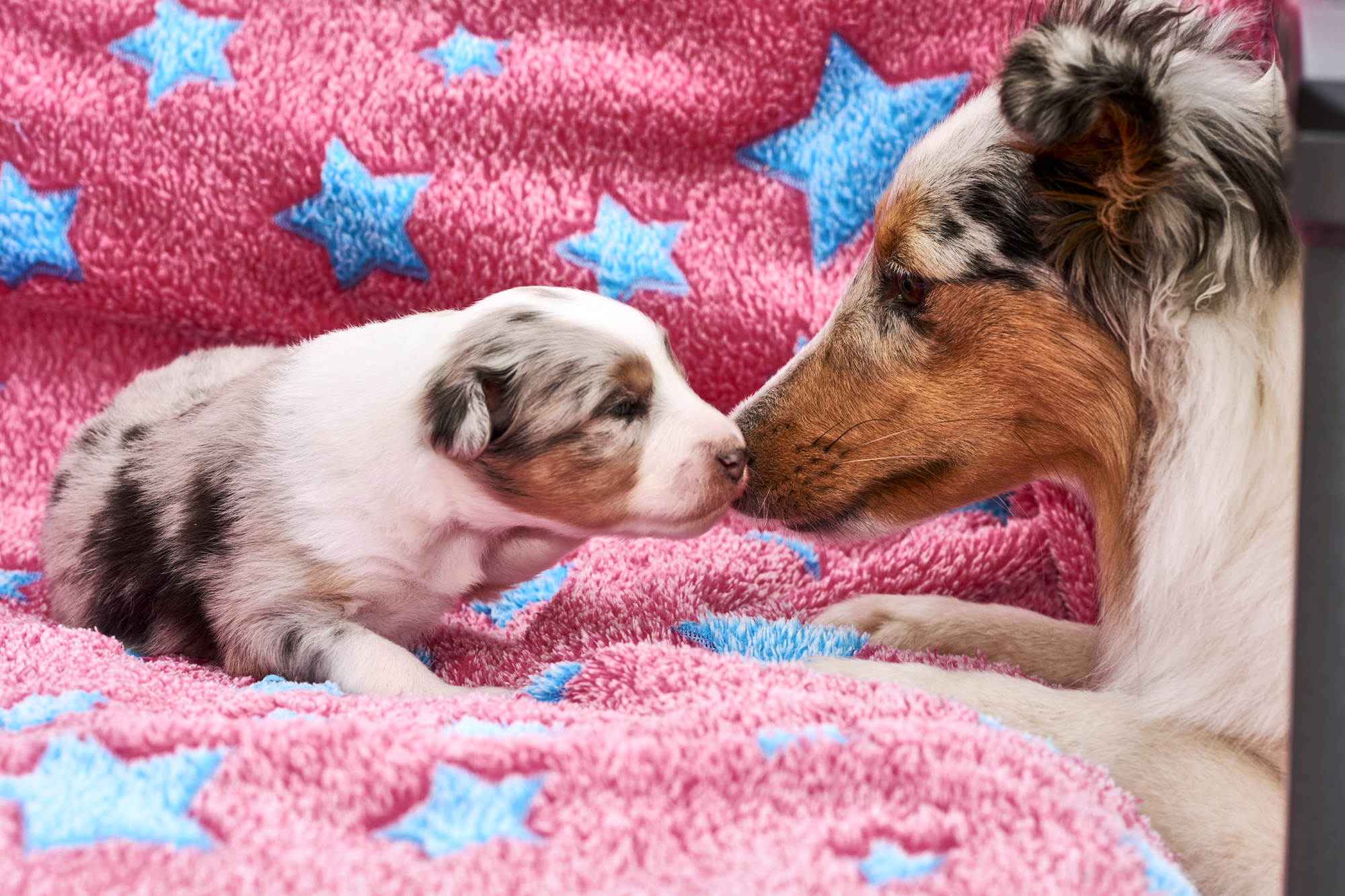 Netterweise durften wir uns an der Auswahl des Rüden beteiligen. Das Glück war uns diesmal hold und machte Sunny zur Mutter einer quitschfidelen blue-merle Hündin. Nomen est Omen – den Namen „Hope“ wählten Ihre Züchter. Wir fanden den so passend, dass wir den Namen beibehalten haben. Vielen Dank an Candy und Andreas, dass Sie uns Ihre Gute-Laune-Maus anvertraut haben.