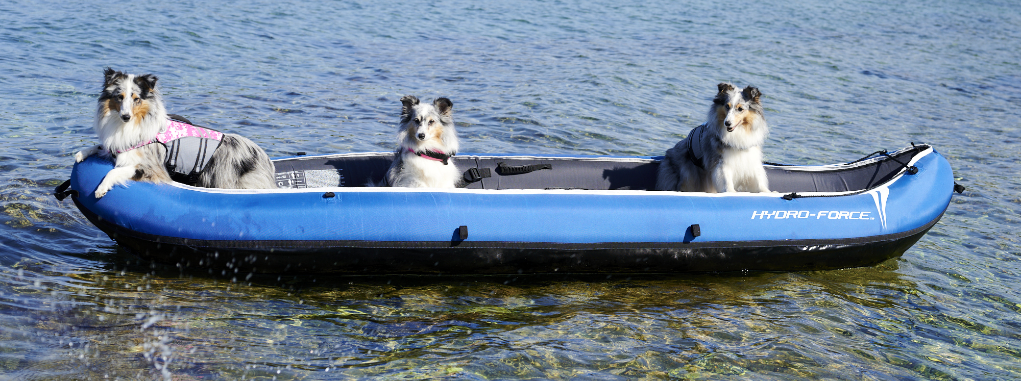 Die Shelties sind keine Wasserratten, aber die Spiele fahren gerne SUP oder baden auch mal mit Herrchen und Frauchen.