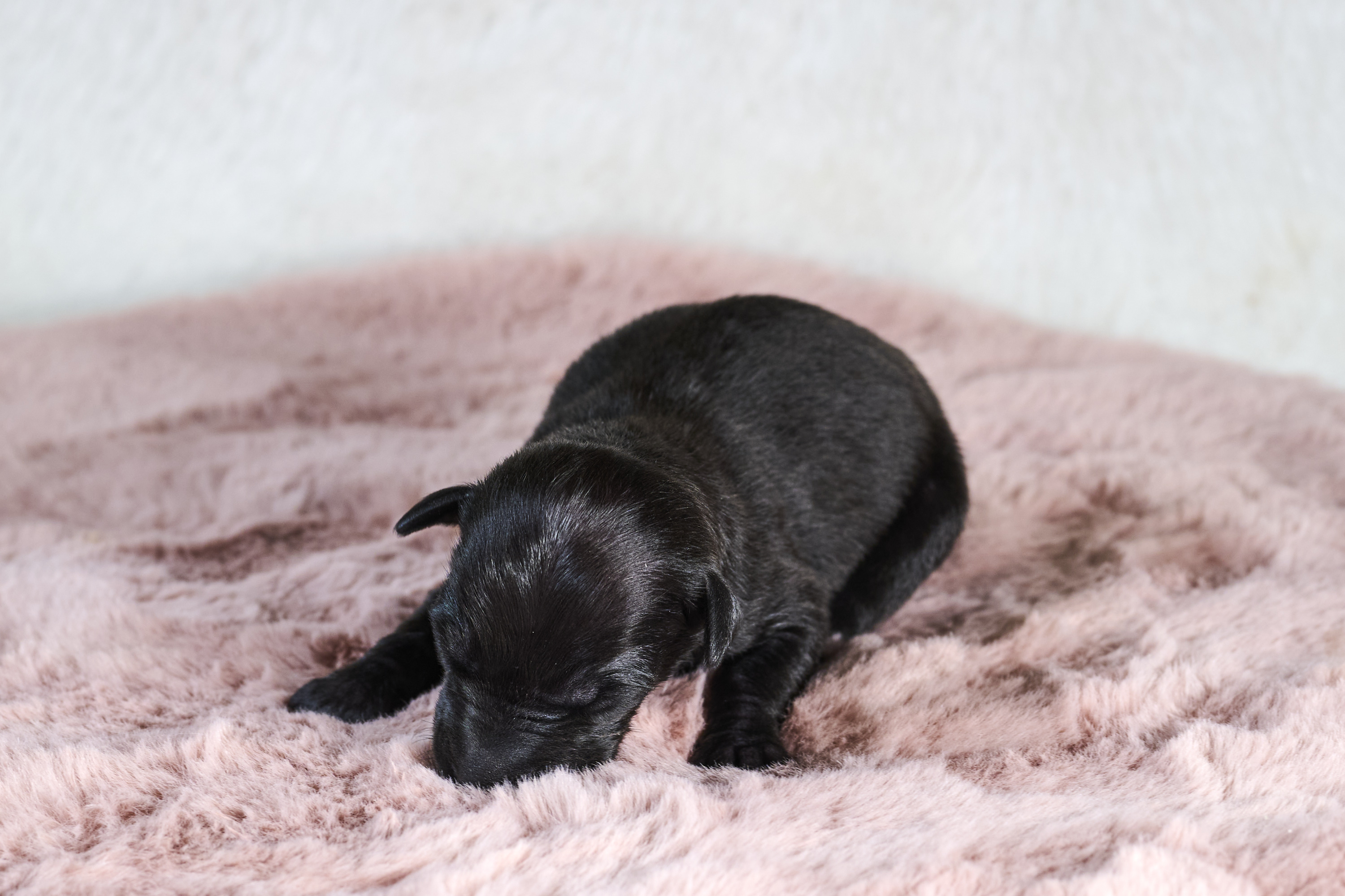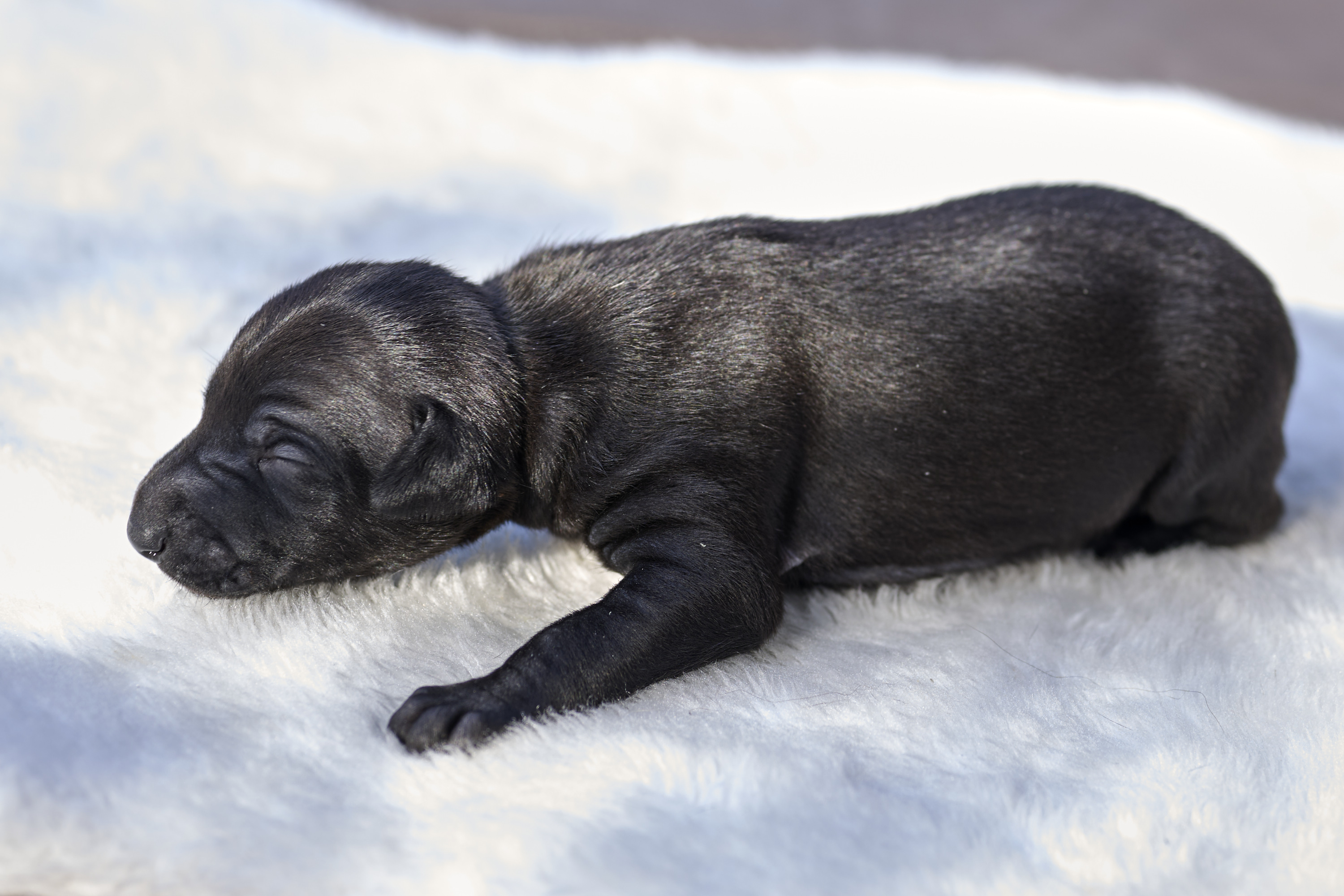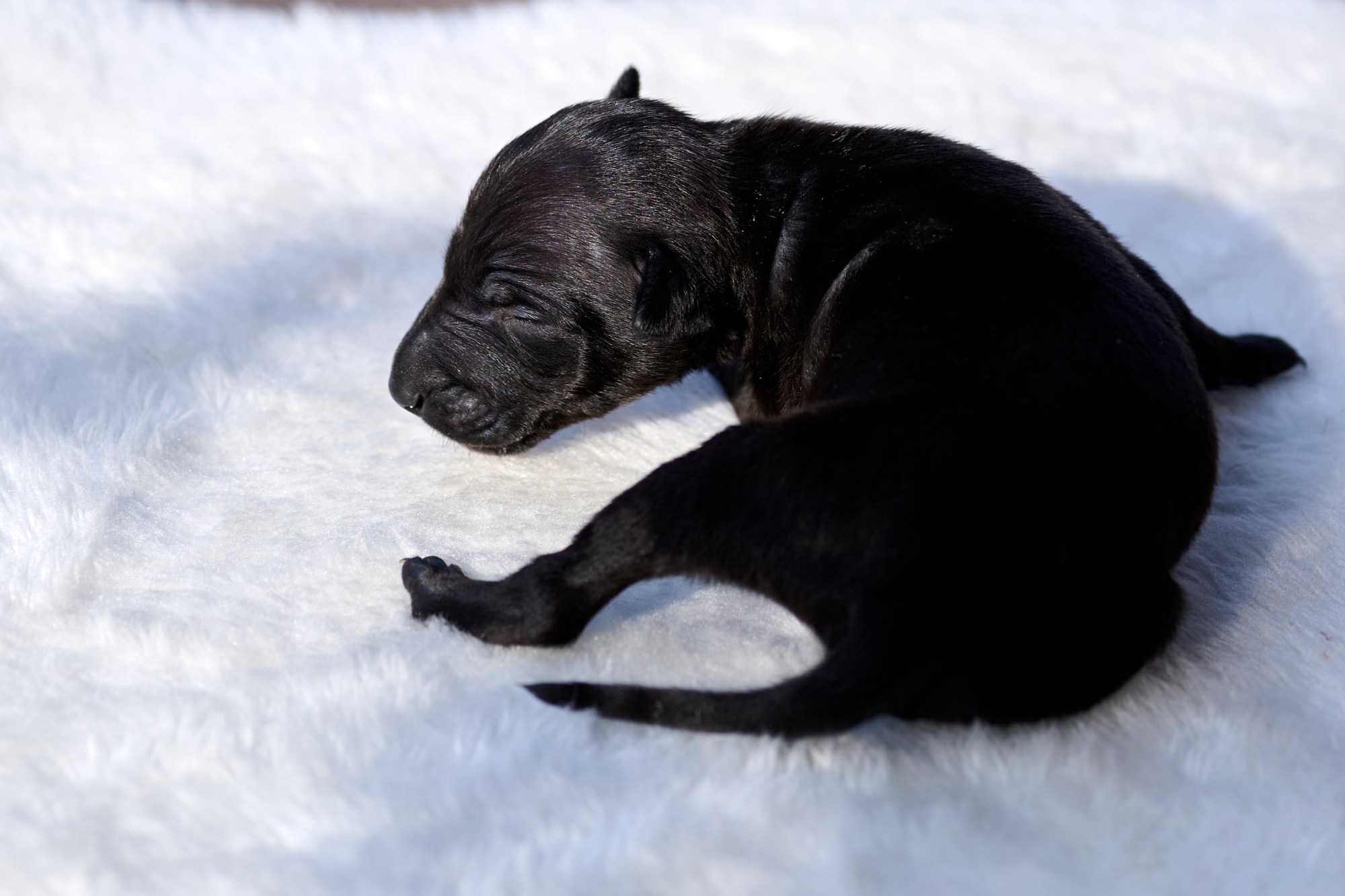 Jetzt beginnen Sie, die Äuglein zu öffnen. Die Hündin ist die erste. Ein kleiner Spalt ist geöffnet und wir sehen das Glitzern ihrer kleinen Äuglein – auf dem Foto unten ist das gut zu sehen.. Die Ohren waren bis jetzt komplett geschlossen und auch die öffnen sich jetzt langsam.