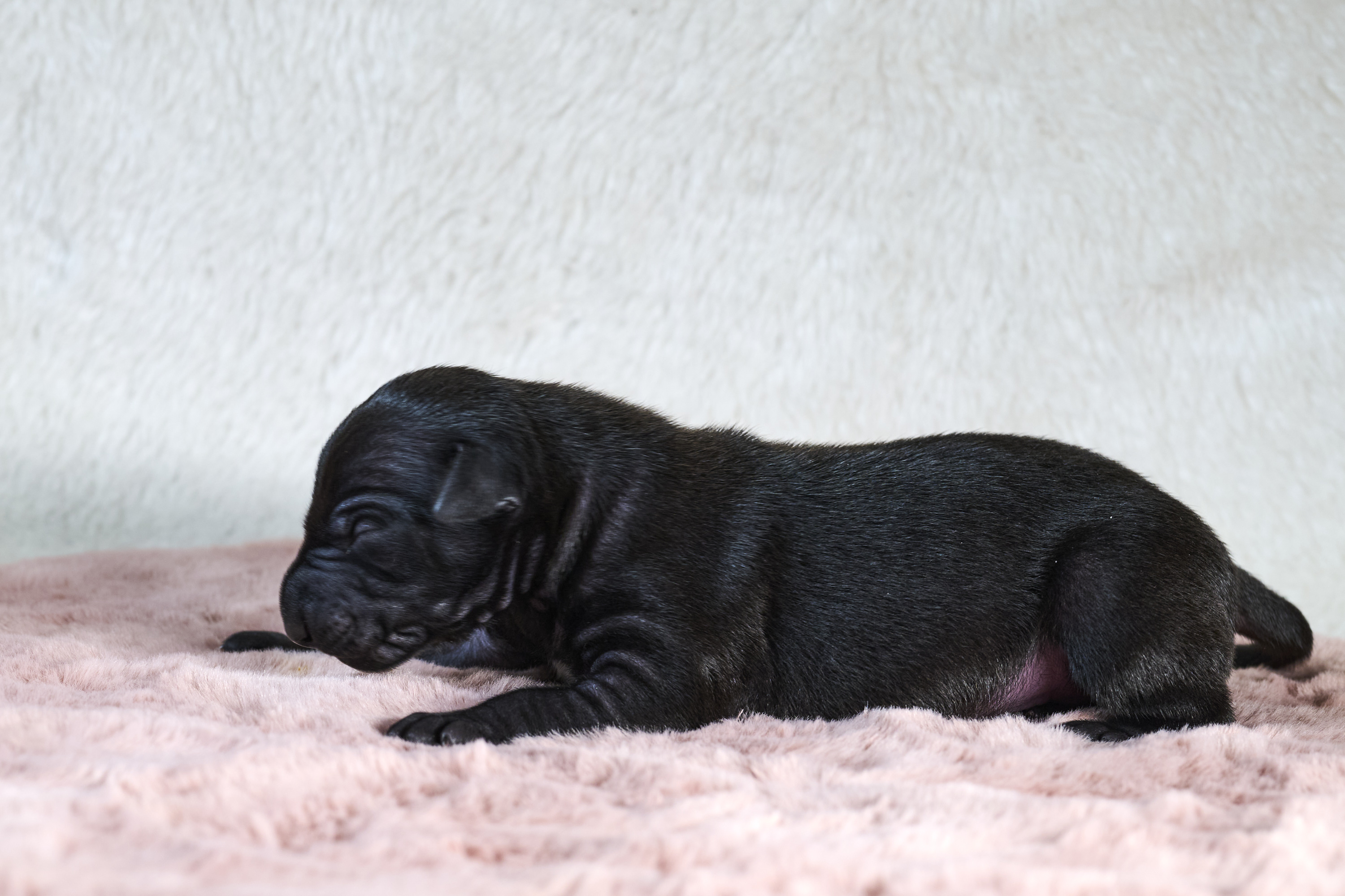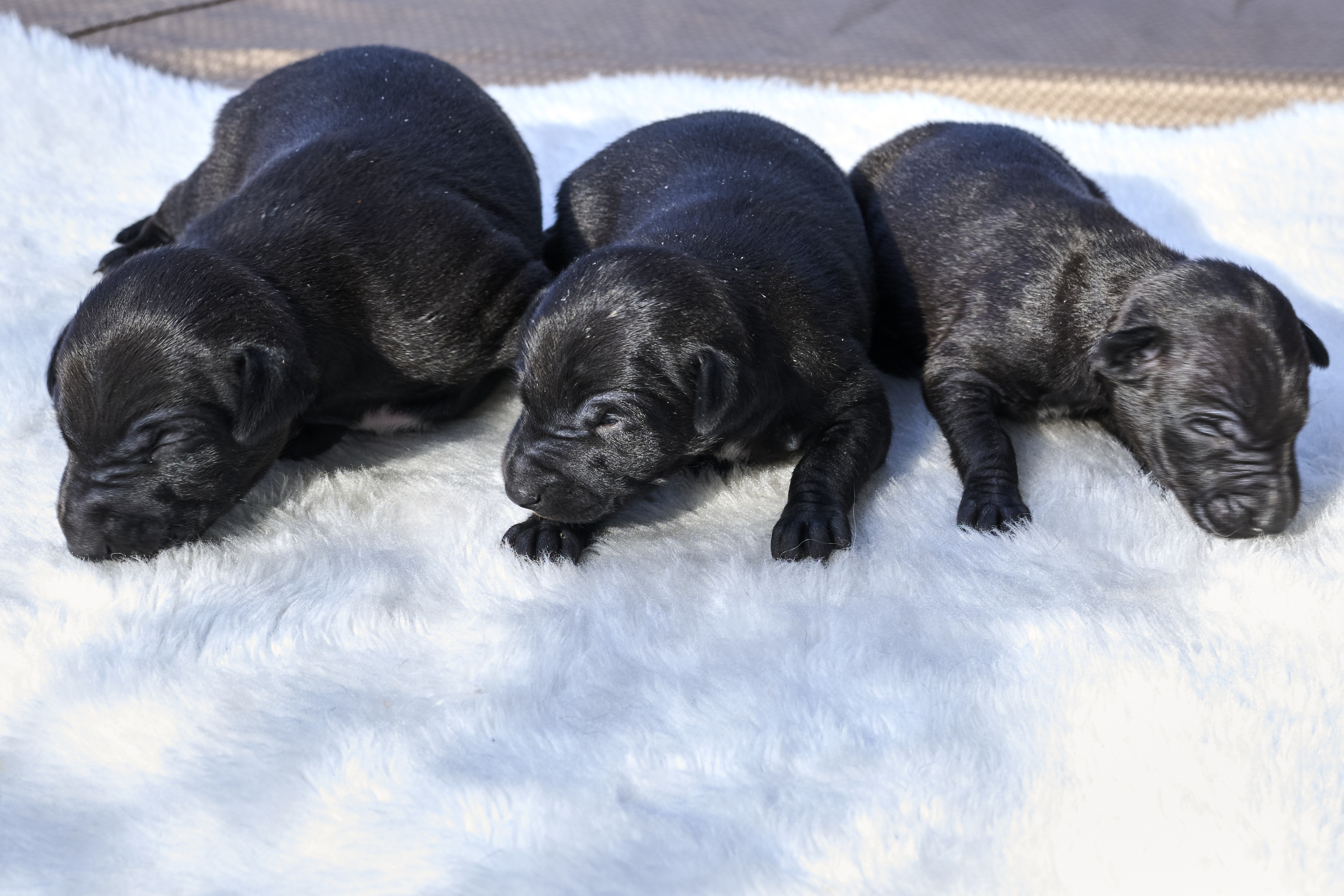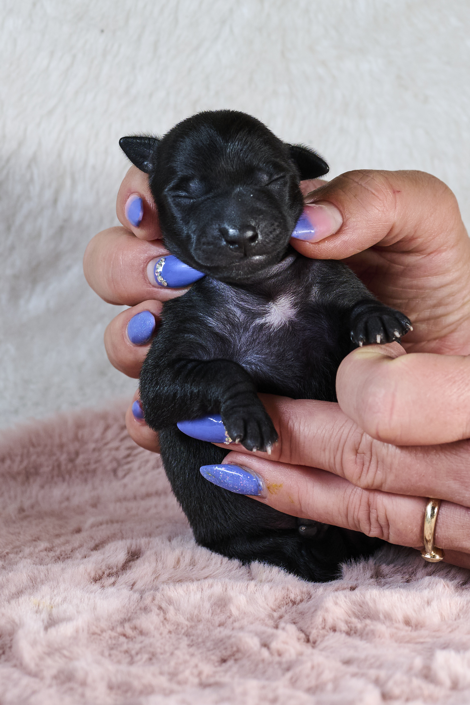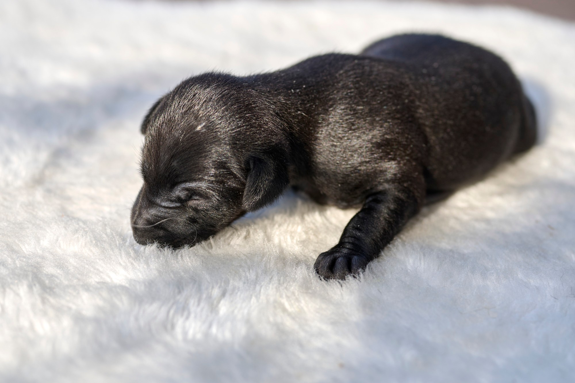 Jetzt beginnen Sie, die Äuglein zu öffnen. Die Hündin ist die erste. Ein kleiner Spalt ist geöffnet und wir sehen das Glitzern ihrer kleinen Äuglein – auf dem Foto unten ist das gut zu sehen.. Die Ohren waren bis jetzt komplett geschlossen und auch die öffnen sich jetzt langsam.