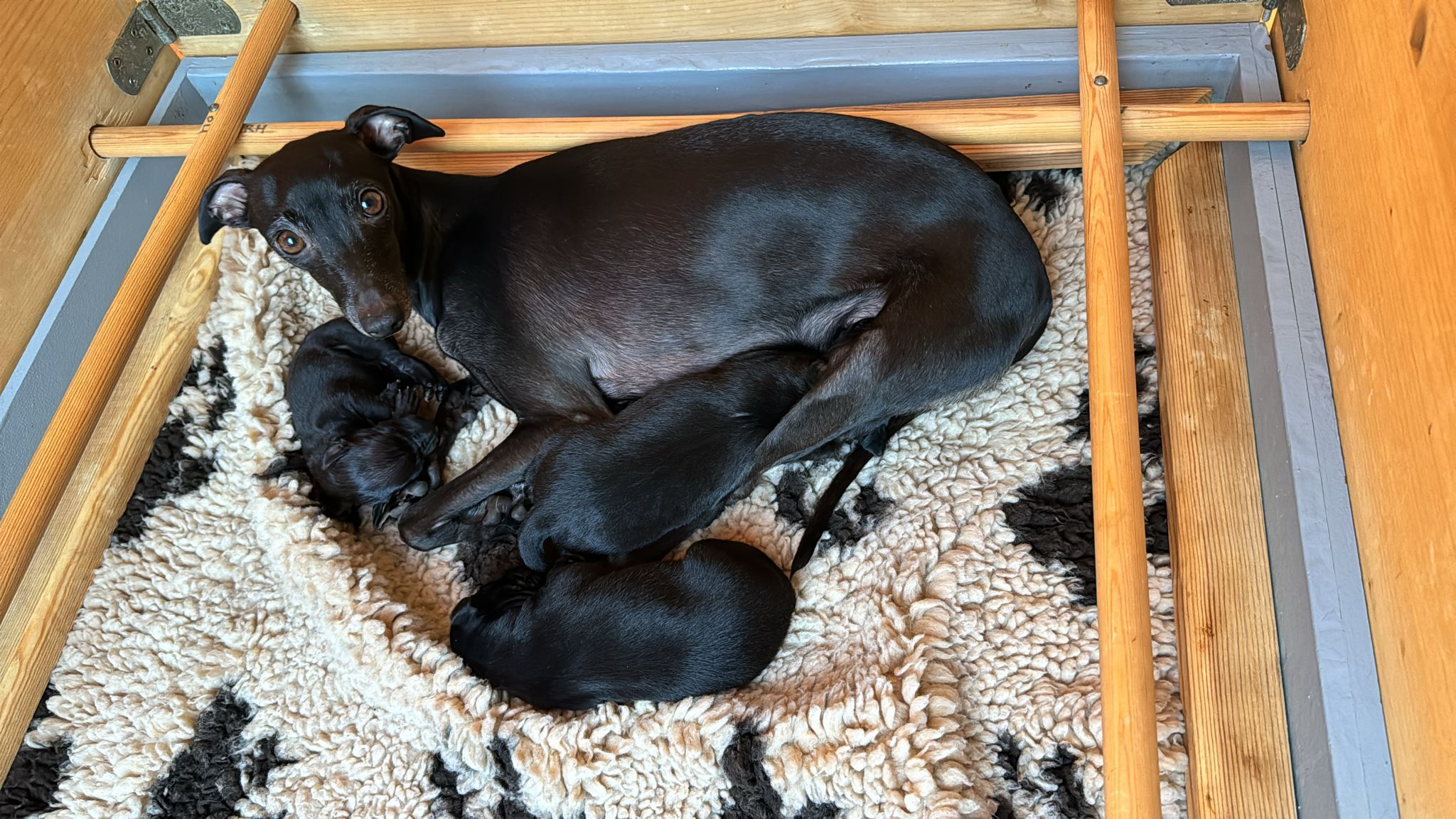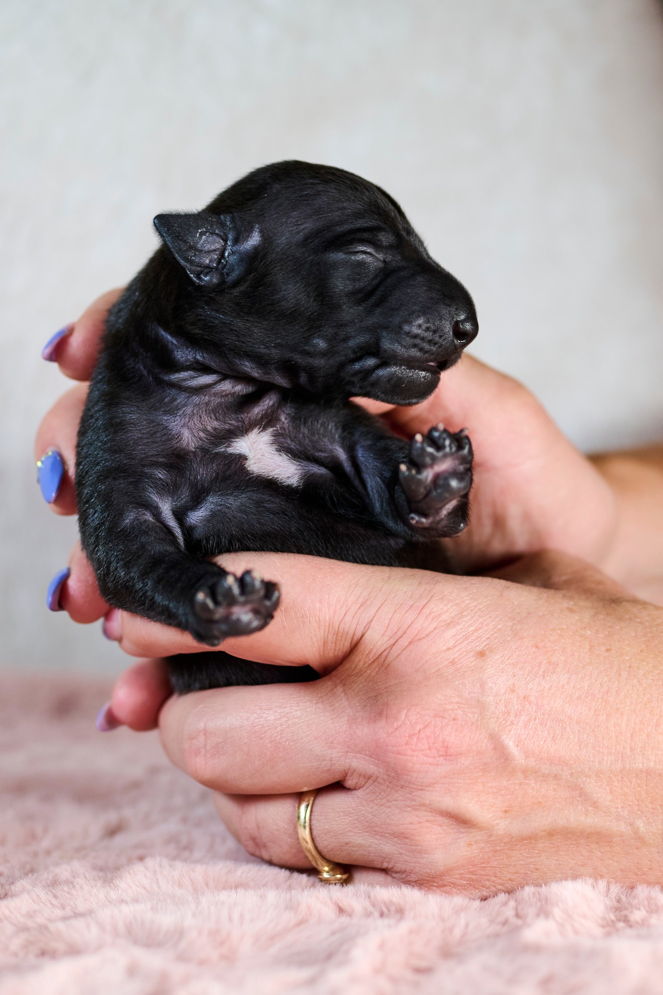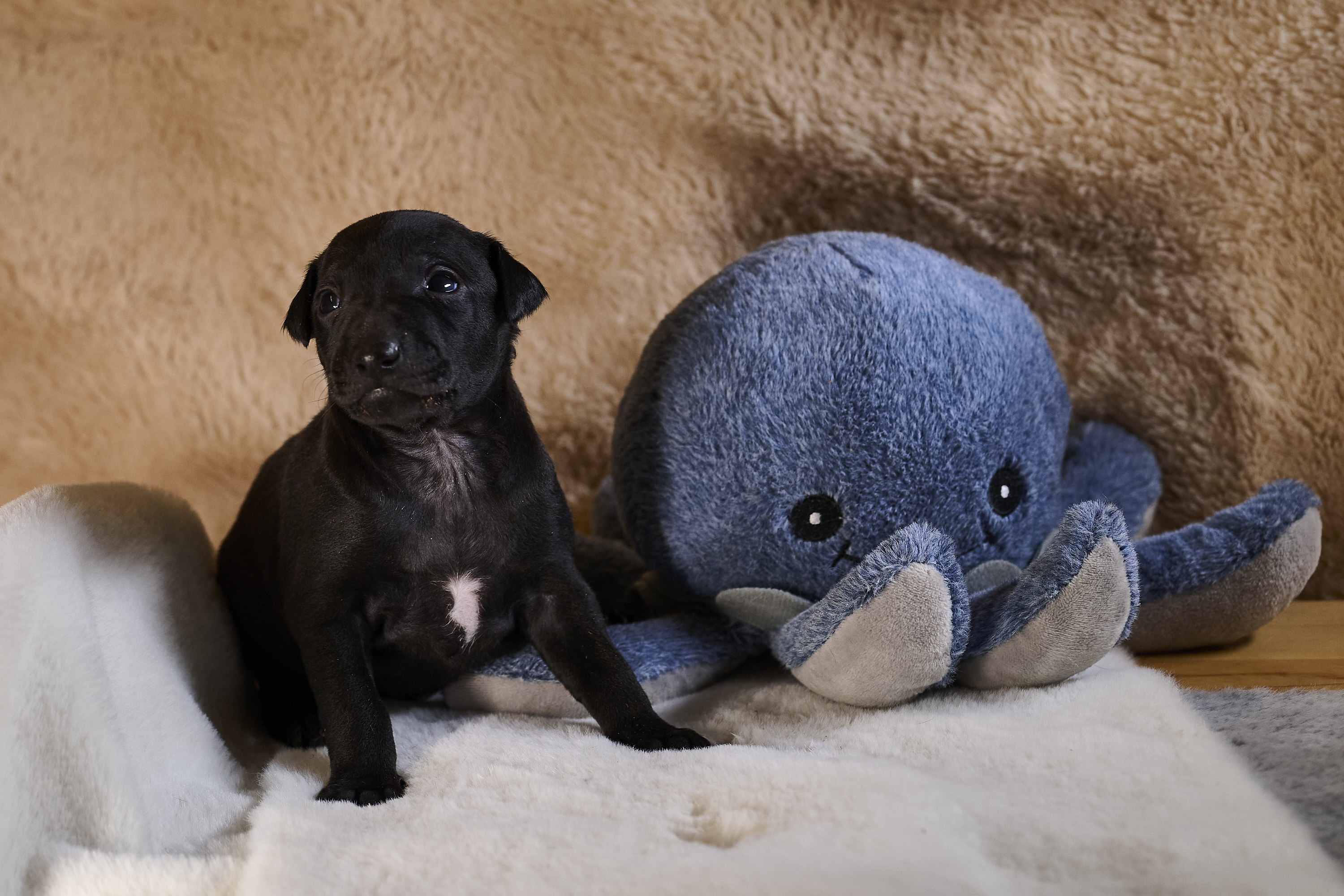 Rüde 1 nimmt richtig gut zu. Er hat nach nicht einmal einer Woche sein Gewicht schon verdoppelt. Er ist ein gemütlicher kleiner Kerl, der immer an Mama hängt, wenn er nicht gerade schläft.